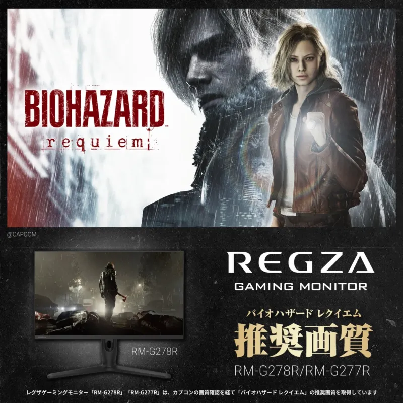 TVS REGZA株式会社は、株式会社カプコンの大人気ゲーム『バイオハザード レクイエム』とのタイアッププロモーションを2025年9月から展開しているのですが、このたび、レグザゲーミングモニターの「RM-G278R」と「RM-G277R」が、『バイオハザード レクイエム』の推奨画質認証をバッチリ取得したと発表されました!