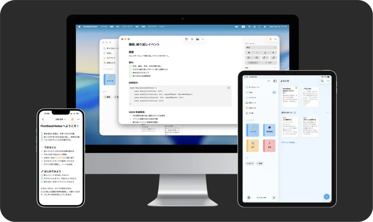 株式会社ファーストシードから、あなたの頭の中にある言葉を整理し、自然に行動へとつなげてくれる次世代ノートアプリ「FirstSeedノート」がリリースされました!iOS 26とmacOS 26に対応しているので、iPhone、iPad、Macでどこでもあなたの思考をサポートしてくれますよ。