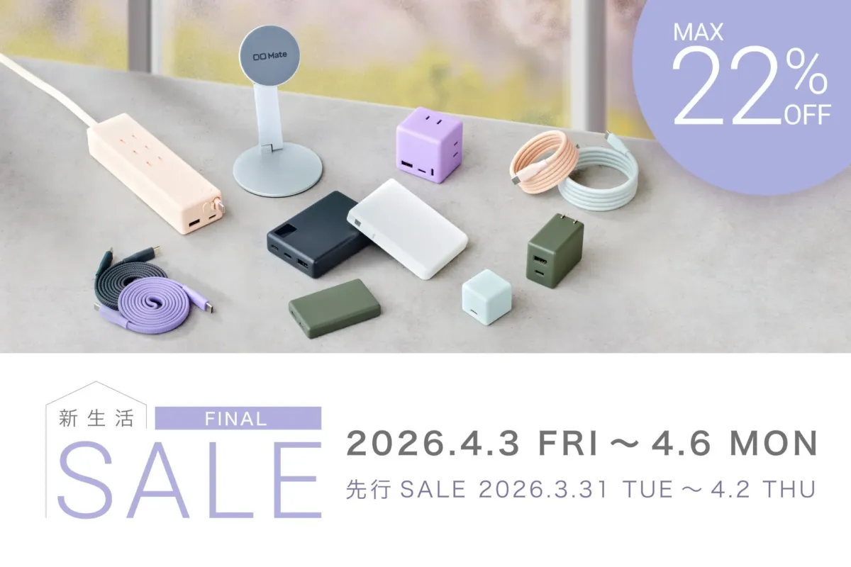 「先行セール」は2026年3月31日(火)00:00から4月2日(木)23:59まで、「Amazon 新生活セールFinal」は2026年4月3日(金)00:00から4月6日(月)23:59まで開催されます。期間中は、PC充電機器を中心に、充電器やモバイルバッテリー、ケーブル、スマホスタンドなど、幅広い人気ガジェットが最大22%OFFでお得に購入できます。