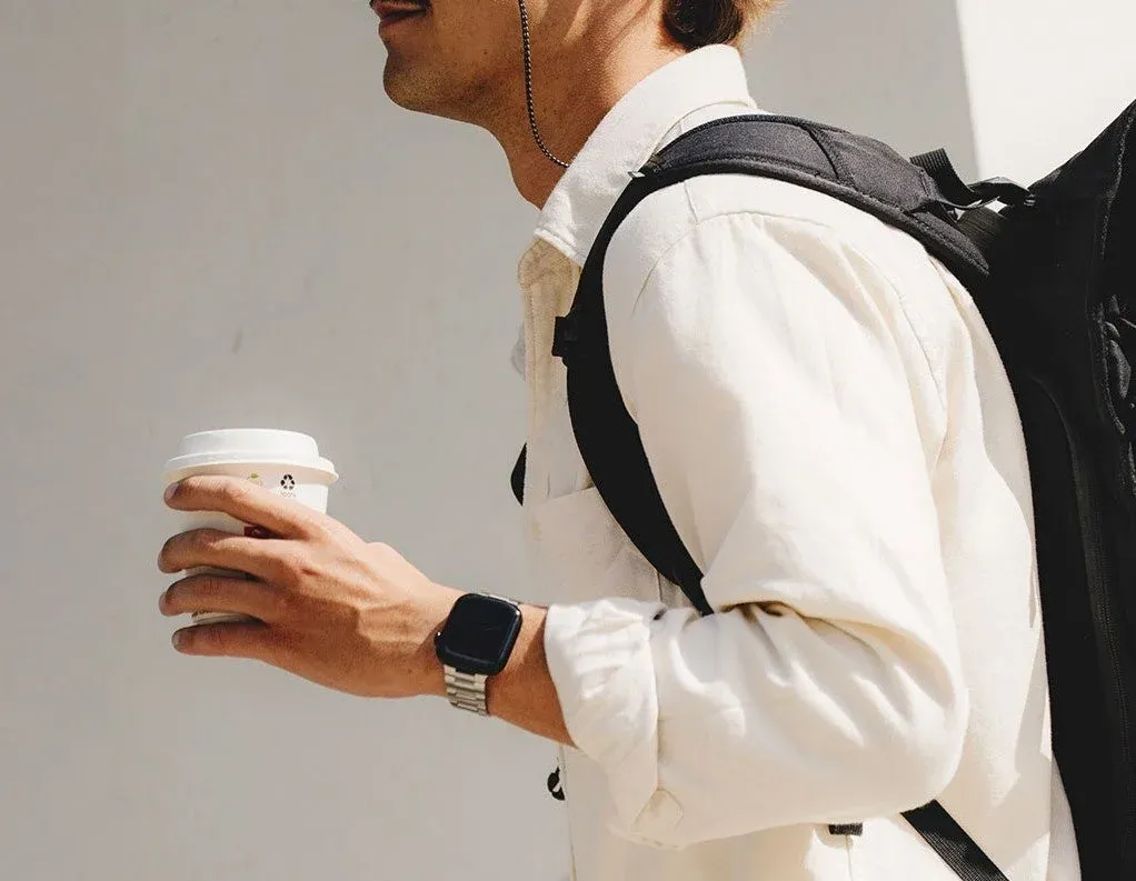 バンドの着脱もスマートに。ワンタッチでスムーズに着け外しができる留め具を採用しています。スリムなデザインでApple Watchとの一体感も高く、手首から外れにくいループ形状なので、安心してアクティブなシーンでも使えますよ。