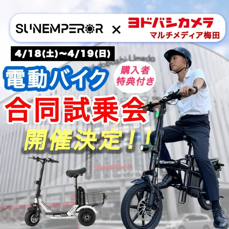 「Sun Emperor(サンエンペラー)」が手がける最新の電動モビリティを体験できる合同試乗会が、2026年4月18日(土)と19日(日)の2日間、ヨドバシカメラ マルチメディア梅田で開催されます!