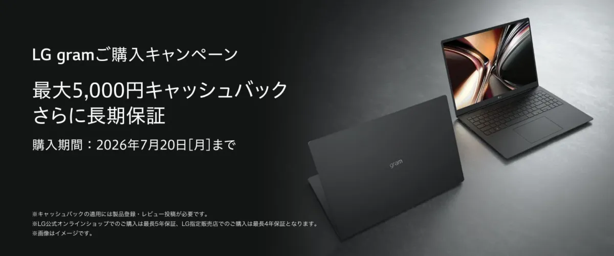 LGエレクトロニクス・ジャパンから、モバイルノートパソコン「LG gram」シリーズをお得に手に入れられるビッグニュースが届きました!本日2026年4月22日(水)から、『LG gramご購入キャンペーン』がスタート。対象モデルを購入してレビューを投稿すると、最大5,000円のキャッシュバックと、安心して長く使える長期保証が受けられますよ。