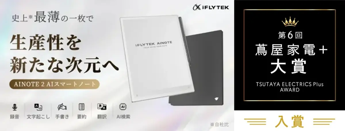 音声AIと人工知能分野で世界をリードするiFLYTEK JAPAN AI SOLUTIONS 株式会社が展開する次世代電子ペーパー「iFLYTEK AINOTE 2」が第6回「蔦屋家電+ 大賞」で3位、「iFLYTEK AINOTE Air 2」が9位に輝き、見事W入賞を果たしました!
