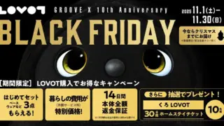GROOVE Xは創業10周年を記念し、2025年11月1日(土)から30日(日)まで「LOVOT BLACK FRIDAY」を開催!『LOVOT』本体購入で「はじめてセット」がもらえたり、月額サービス料が特別価格になったり、さらに「くろLOVOT」のホームステイチケットが当たるチャンスも!